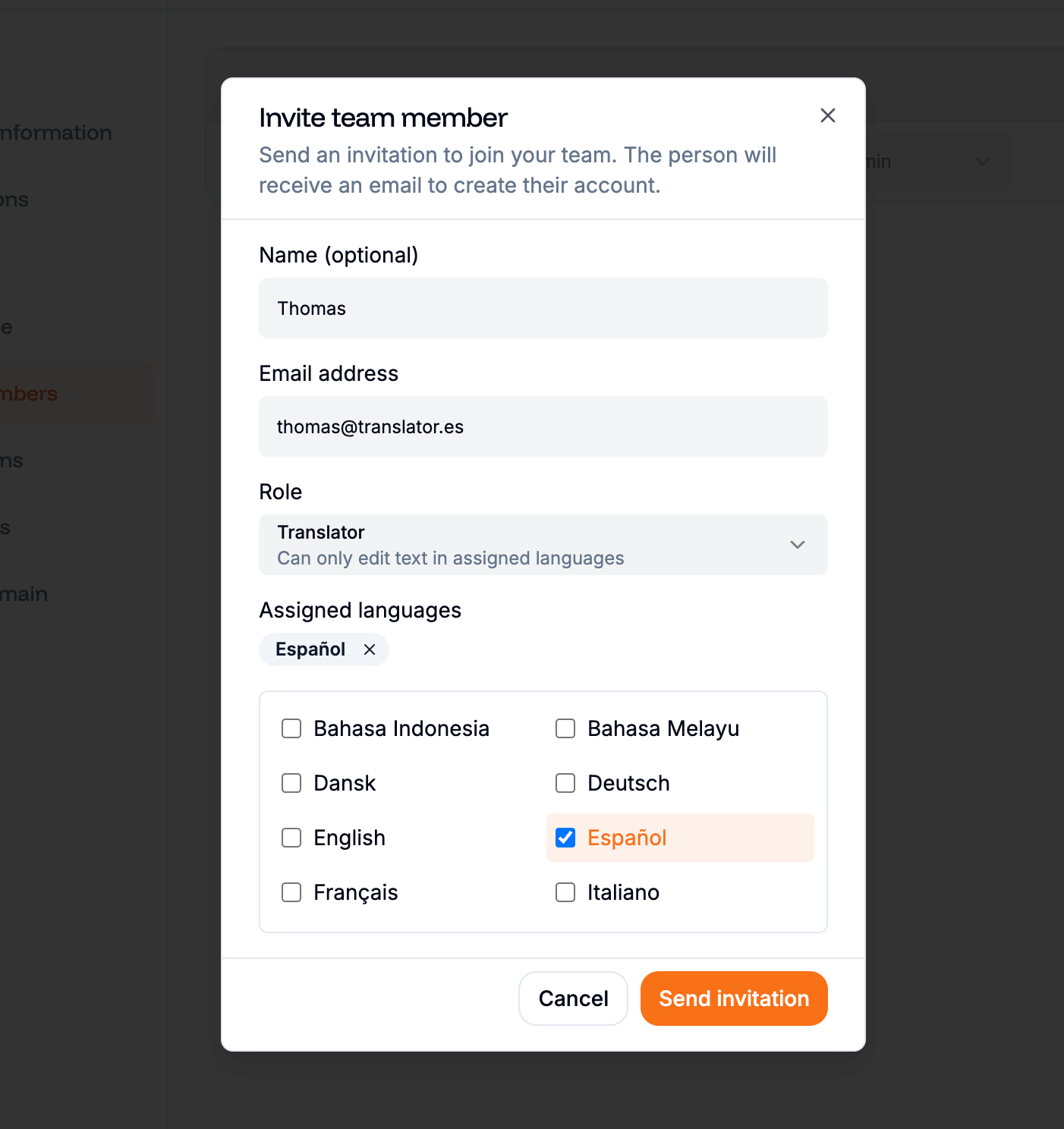 When you select the Translator role, a language selector appears. Pick the languages this translator is responsible for. You must assign at least one language.